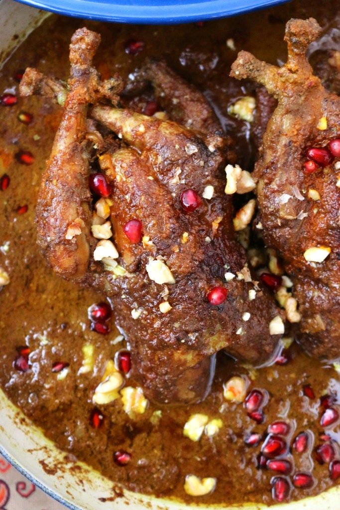 زمانی که مرغها کاملا پخته شدند و سس خورش غلیظ شد؛ خورش آمادهست. خورش را با دانههای انار تزئین کرده و همراه با برنج یا نان سرو کنید.
